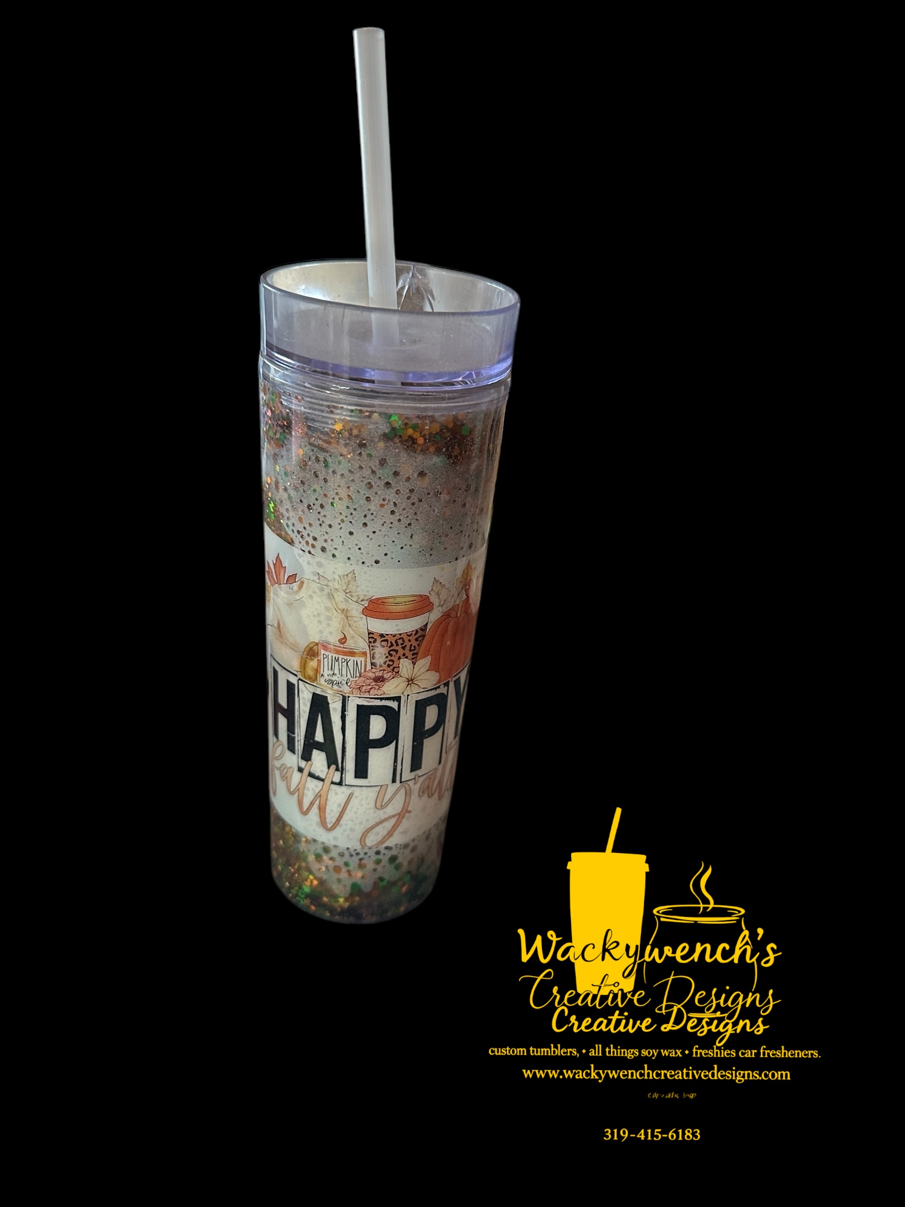 16 oz. Acrylic tumbler, dbl. wall insulated, Snow Gobe w/power wash theme “Happy Fall Ya’ll”